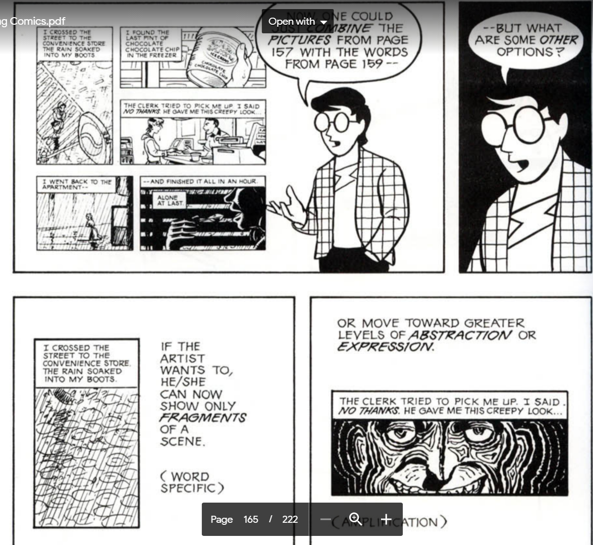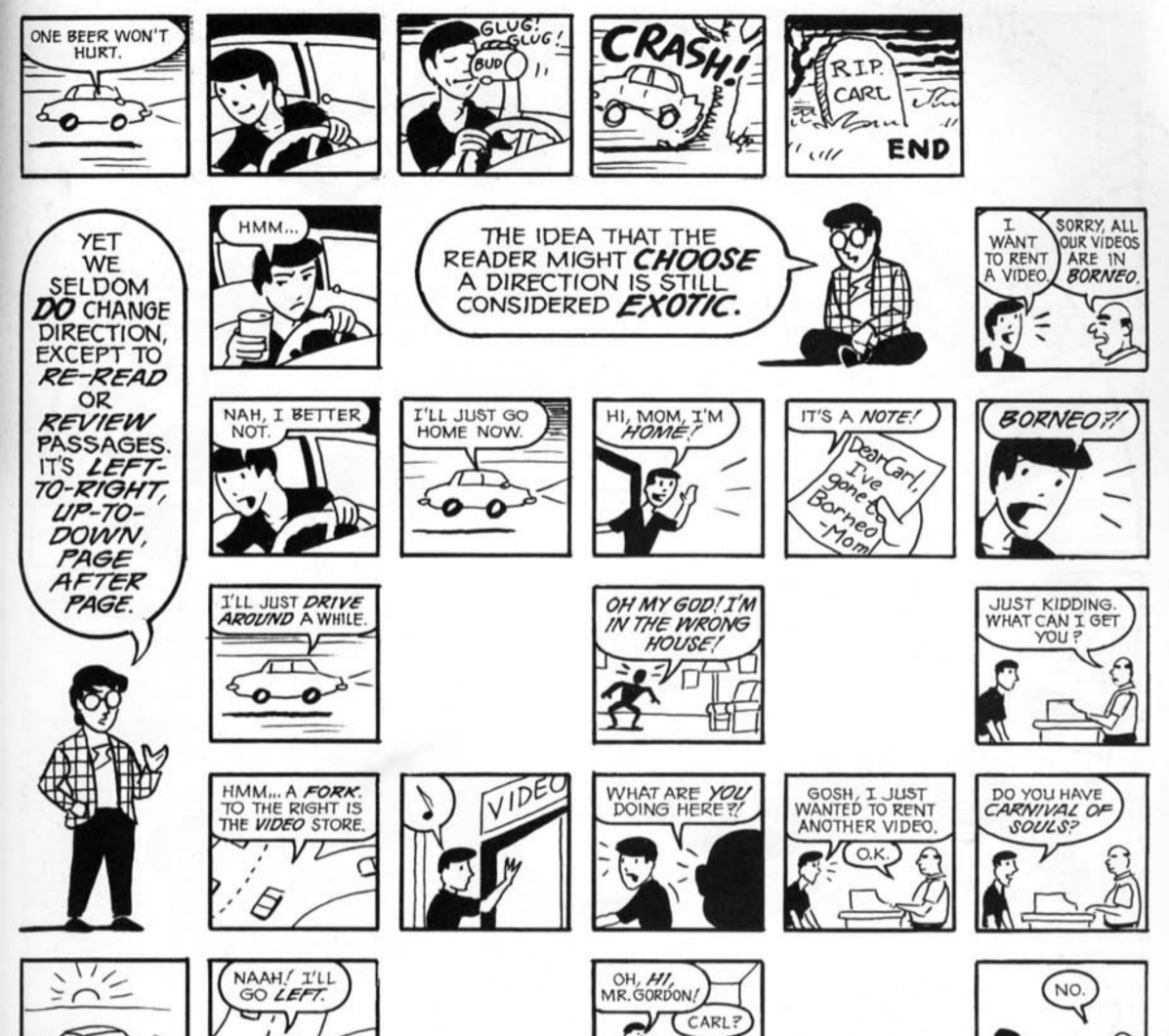 McCloud explores how in comics, the expectation of the literature stands that each panel is the present when being viewed currently, the future when it hasn't been reached yet, and the past after the reader has read it. The reader is expected to read the panels in a left to right fashion; truthful expectations across all literature. But through the use of illustration and format, the author of a comic may bend that expectation and open up oppurtunity for different approaches to the literature.